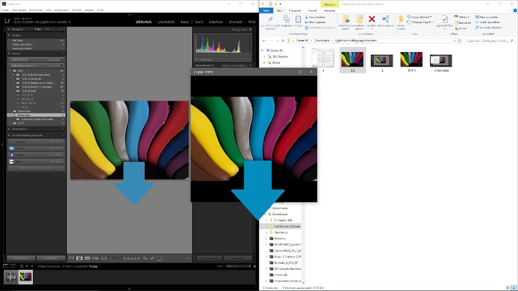 Links ist Lightroom, geöffnet ist die selbe Bilddatei wie rechts im Foto-Programm.