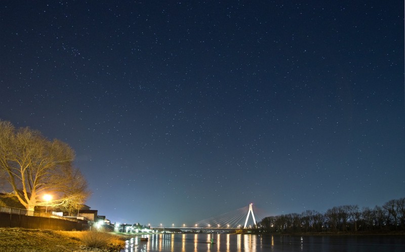 Aber bei Nacht, wenn die Brücke beleuchtet ist, ist die Brücke natürlich besonders reizvoll. Auch sehr schön, wie sich das Licht im Rhein spiegelt.