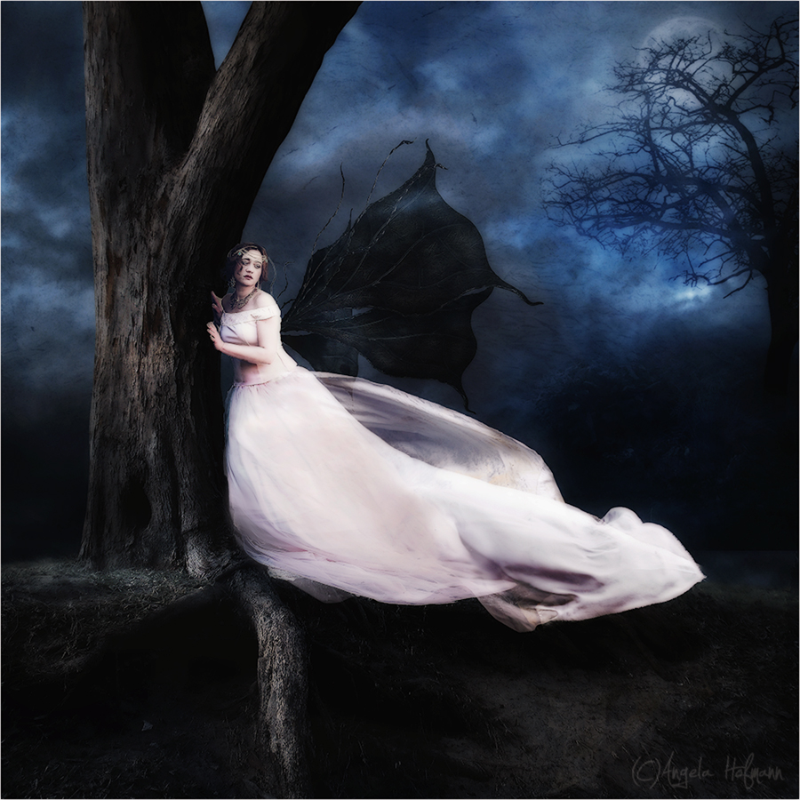 Durch die Farbgebung bekommt das Bild eine mystische, aber auch bedrohliche Wirkung. Der kalte Hintergrund, der auch eher in kühlen Farben gehaltene Baum, der dem Mädchen dennoch Schutz und ein bisschen Geborgenheit gibt, regt die Phantasie an. Durch die Flügel, in starkem Kontrast zu dem hellen und unschuldigen Weiß des Kleides, ist das Mädchen vielleicht doch nicht ganz so unschuldig, wie die Farbe des Kleides vermuten lässt, obwohl sie eher schutzsuchend wirkt.