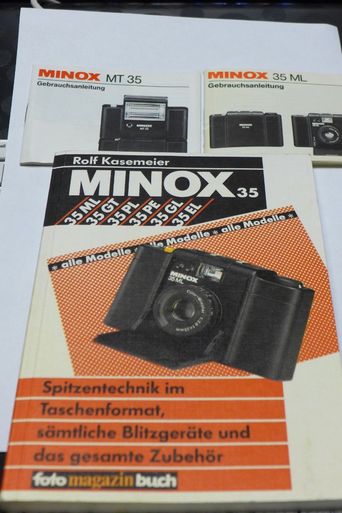Minox 35 PL + Blitzgerät MT 35 + Ledertasche + original Kamera Aufbewahrbox. + Fotomagazin-Handbuch „Minox Baureihe 35“ von Rolf Kasemeier. Neuwertig, ein echtes Sammlerstück. Eine Analog-Kamera, die Hobby- wie Profifotografen immer noch begeistern kann. Mit dem Superobjektiv Color-Minotqr 1:28 / 35 mm. Spitzentechnik für alle Bereiche im Taschenformat. Dazu das Blitzgerät MT 35, (mit und ohne Computerautomatik. Sspeziell für diesen Kameratyp gefertigt für Filempfindlichkeit von 25/15 bis ISO 1600/33. Leitzahl für ISO 100/21 DIN = 26, Blitzdauer ca. 1/1000 bis 1/30.000 Seikunde. Alles in gewohnter Minox-Qualität.